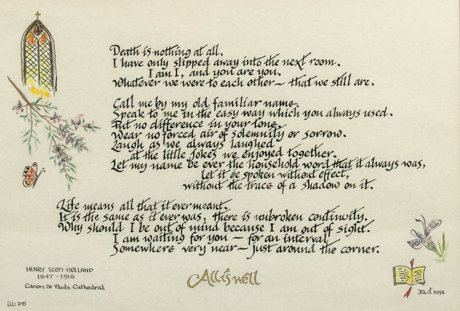 Mary Frye circulated the poem privately. Because she never published or copyrighted it, there is no definitive version. She wrote other poems, but this, her first, endured. Her EwaltElizFryeobituary in The Times made it clear that she was the author of the famous poem, which has been recited at funerals and on other appropriate occasions around the world for eighty years. The poem was introduced to many Britons when it was read by the father of a young soldier, Stephen Cummins, killed by a bomb in Northern Ireland. The soldier’s father read the poem on BBC radio in 1995 in remembrance of his son, after having found it in an envelope addressed “To all my loved ones” in his son’s personal effects.
