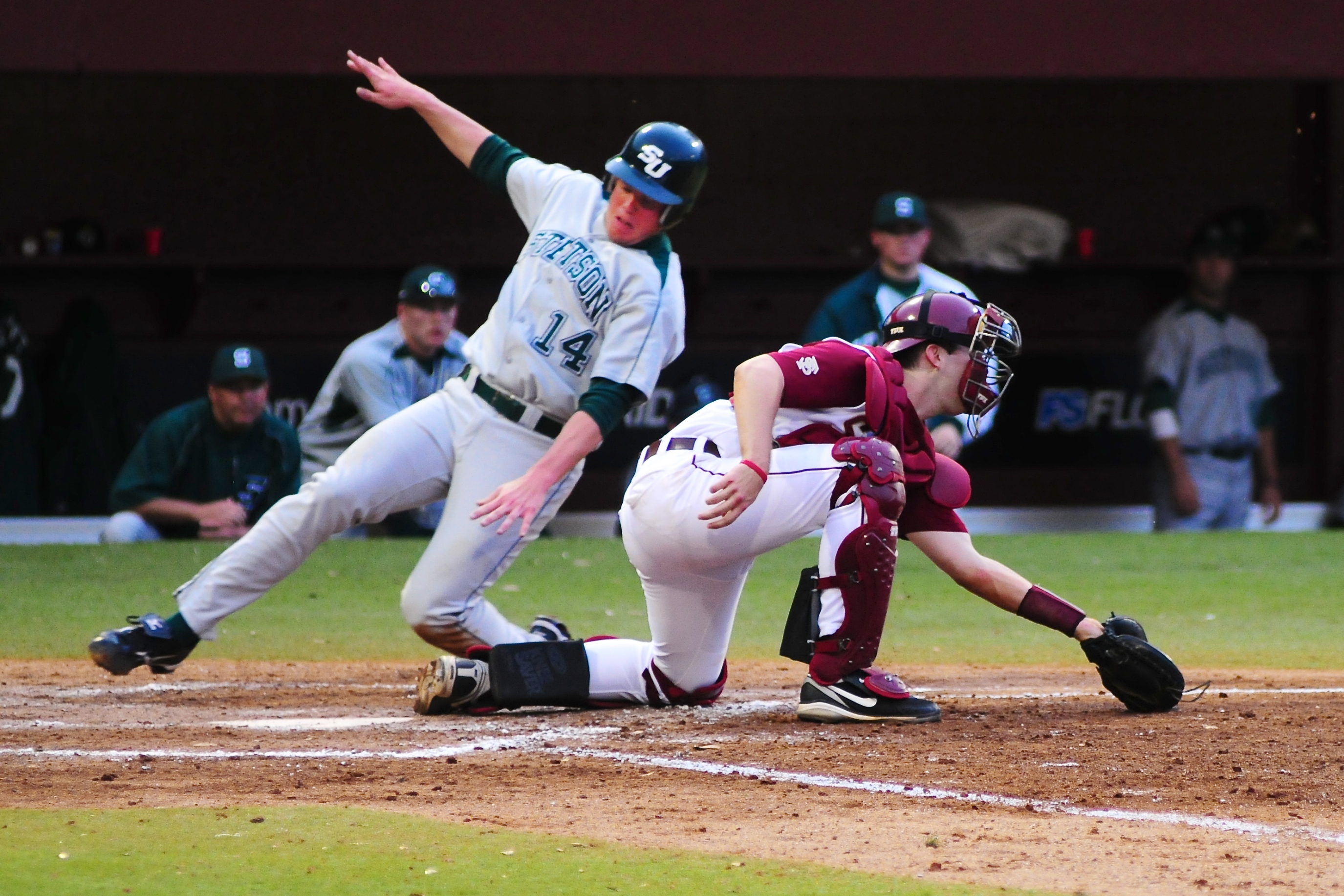 24 March 2010: Stetson’s Kyle Maulbetsch (14) slide into home as FSU’s Parker Brunelle (7) tries to tag him out during Florida State’s 14-7 victory over Stetson on Wednesday inside of Mike Martin Field at Dick Howser Stadium.