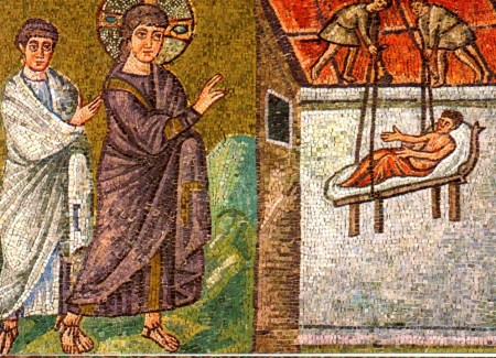 The story of the paralytic is one of the more interesting anecdotes in the Bible….I wonder who those four friends were. Were they close to the paralyzed man? Were they family, or relatives? Did they carry him to Jesus because of compassion or pity or love or duty? Did all four know each other and him, or were one or two of them friends of the other two and helped out of their friendship for the other litter-bearers as opposed to friendship for the paralyzed man?