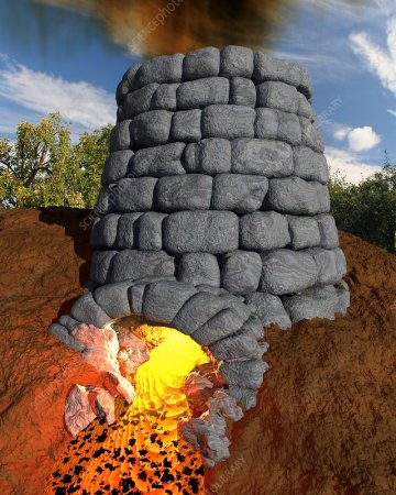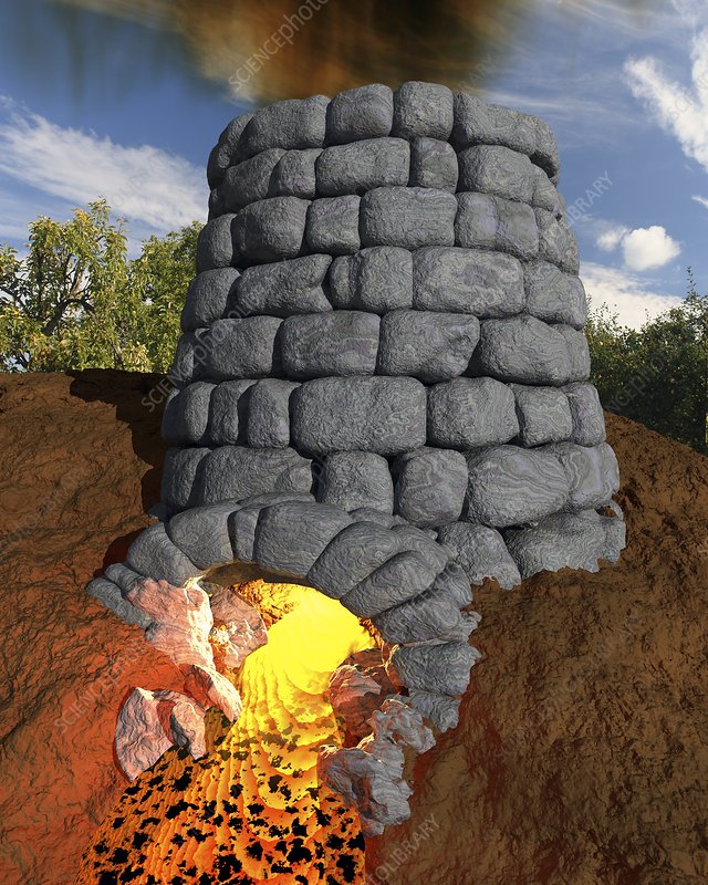 Iron-smelting furnace. Artwork of the structure of a traditional smelting furnace. This stone or brick structure is filled with iron ore and coke (fuel with a high carbon content) and ignited. When the smelting process is complete, the molten slag flows out of the outlet (slag notch, bottom) and the molten iron is collected in the bottom of the furnace. This smelting process is more difficult for iron than for other metals (higher temperatures are needed). Iron smelting did not become widespread until around the first millennia BC. The switch from charcoal to coke as the fuel took place much later, in around the 18th century in the UK.